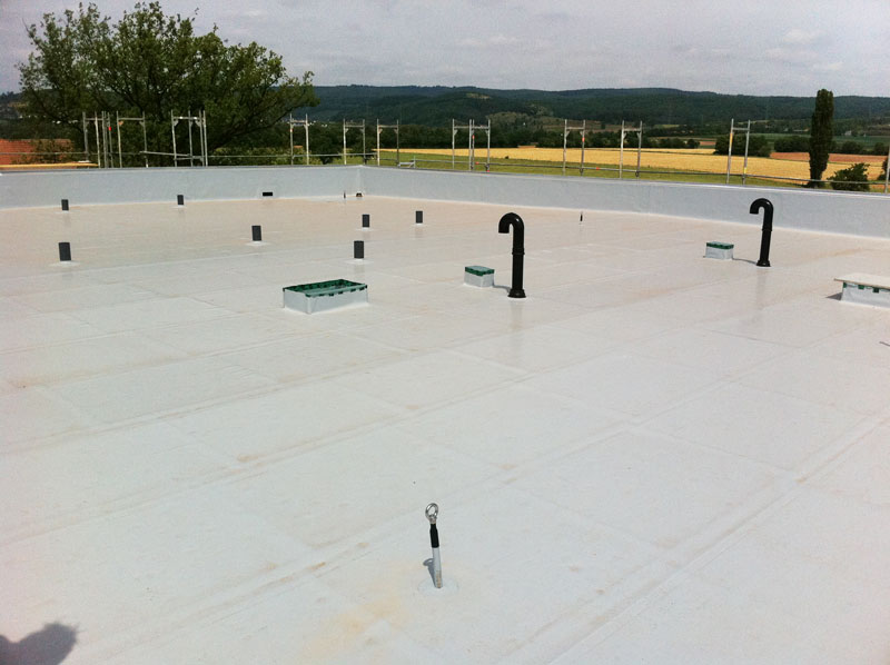 Kuststoffbahnen gibt es aus vielzähligen Kunststoffen. Die Palette der Bahnen reicht von PVC über EVA zu FPO und verschiedenen Kautschukarten. Jeder Kunststoff hat auch seine eigens entwickelte Fügetechnik. Aus dieser Produktpalette suchen wir für Ihr Objekt die passende Bahn heraus, um in Kombination mit Wärmedämmung und Schutzfliesen eine dauerhaft funktionierende Abdichtung zu gewährleisten. Eine Abdichtung mit Kunststoffbahnen wird einlagig ausgeführt.