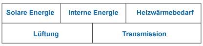 Denn wie in der Skizze erkennbar, errechnet man den Heizwärmebedarf indem von den Verlusten durch Lüftung und Transmission* die Gewinne durch Sonneinstrahlung und interne Wärmequellen, z.B. Körperwärme oder Backofen, abgezogen werden.